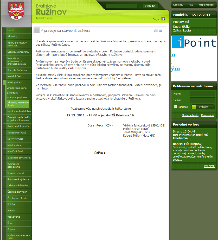 27.2.2012 som mal stretnutie s občanmi, kde som robil odpočet plnenia svojho volebného programu, ako poslanca MČ Bratislava-Ružinov. Hosťom bol primátor Bratislavy Milan Ftáčnik. Ešte raz chcem poďakovať občanom, ktorí sa stretnutia zúčastnili. Keďže sa profesionálne venujem doprave a špeciálne integrovanej doprave, prezentoval som aj projekty na ktorých sa zúčastňujem v Bratislave.